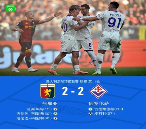 北京时间11月9日22:00,意甲第11轮展开角逐,热那亚坐镇主场迎战佛罗伦萨。比赛开局阶段,厄斯蒂高头球破门,古德蒙德松主罚命中,将比分扳平;下半场伊始,科隆博主罚点球被德赫亚扑出,随后皮科利帮助球队反超比分,但德赫亚失误送科隆博攻入一球。最终比分定格在2-2,最终双方握手言和,各取一分。