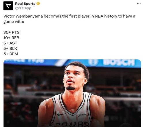 相比于拿下3连胜继续位列西部第二,文班亚马再度打出历史级别表现显然更加值得马刺队开心。