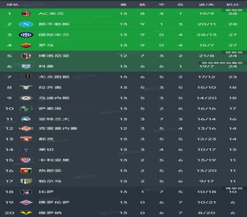 北京时间12月1日,意甲第13轮除了博洛尼亚和克雷莫内塞的比赛还没有进行,已经结束了9场较量,我们一起看看最新积分榜变动!